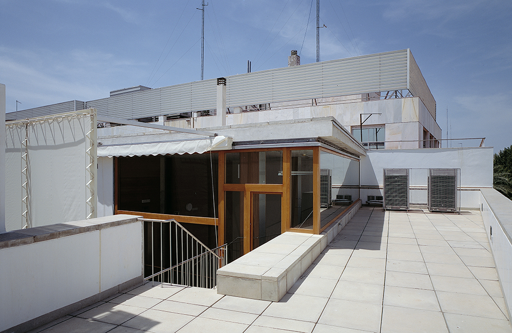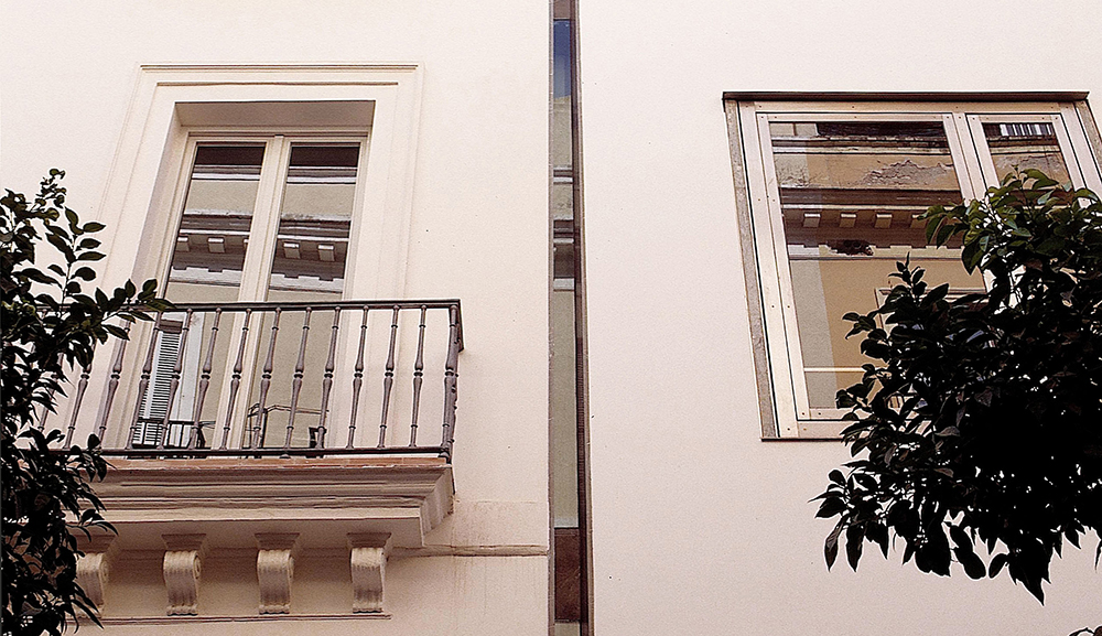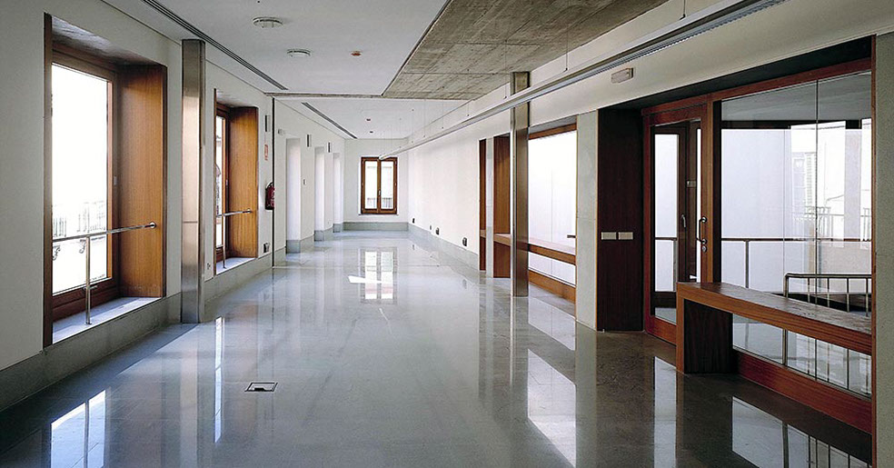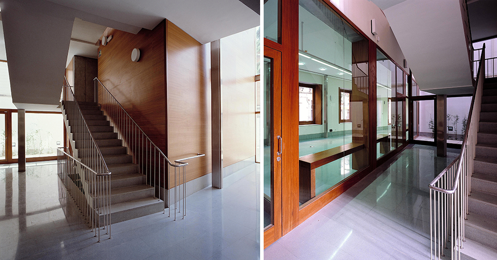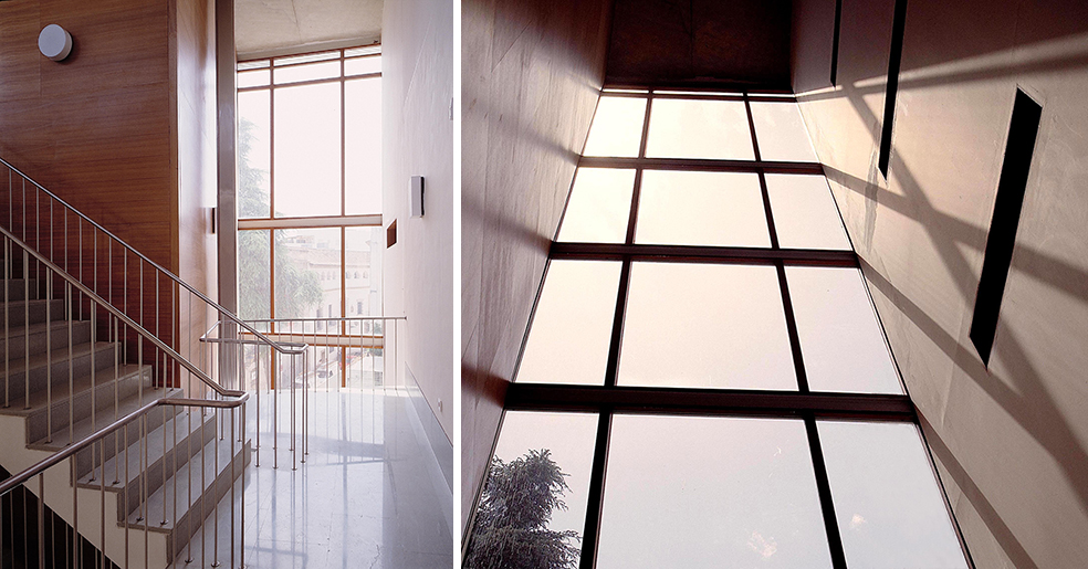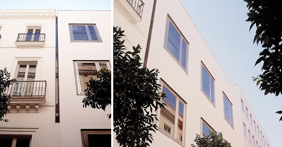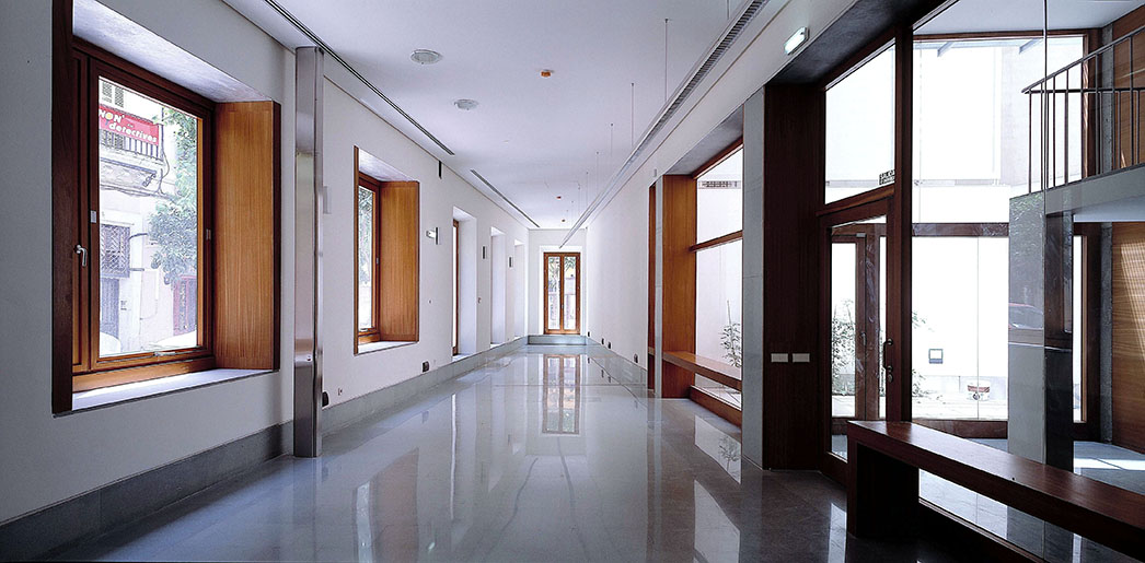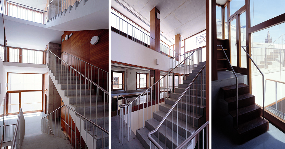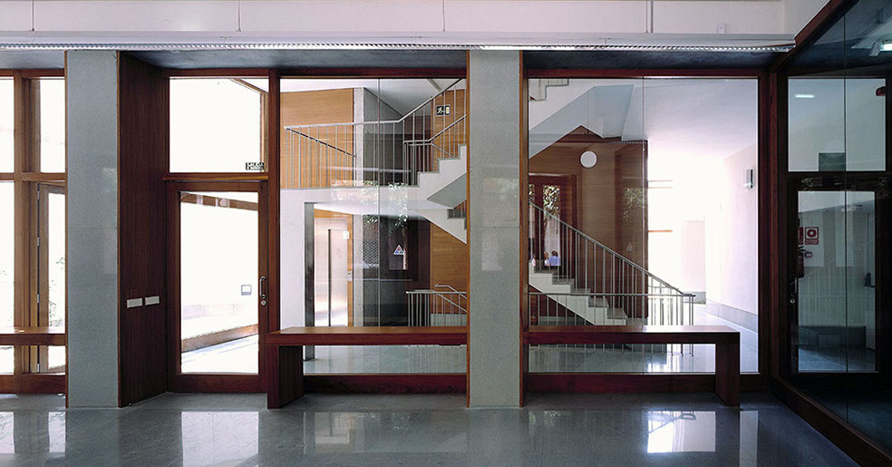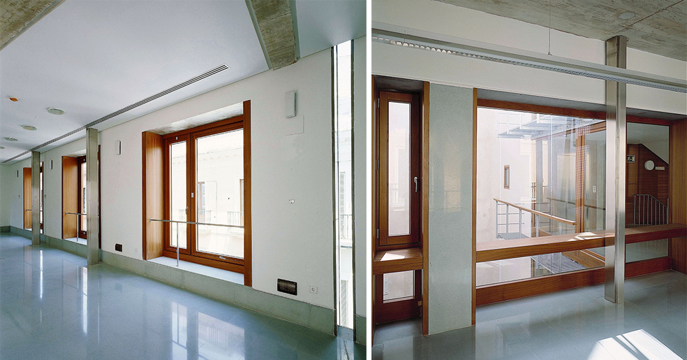 Este último hecho proporciona la obligada situación de un espacio libre dentro del conjunto para salvaguardar la servidumbre. Se establece un programa funcional para la ampliación de oficinas administrativas del edificio original y se decide eliminar el núcleo de comunicación de la parte a reformar y ubicarlo en la medianera del fondo del solar, junto al patio de luz, con suficiente entidad para alojar también un ascensor y cumplir las normativas actuales. La diferencia de niveles entre el conjunto nuevo y el edificio principal se resuelve mediante una escalera que se adapta a en un extremo a las alturas de las oficinas actuales, y en otro a las de la edificación a rehabilitar. Las alturas de las nuevas plantas se orientan en la edificación existente, permitiendo un tratamiento dimensional y de proporciones de la fachada, respetando las características tipológicas y dimensionales de las diversas unidades, adecuando las necesidades funcionales. El núcleo de comunicación, retirado de la fachada, formaliza una pequeña planta de ático y da acceso a la azota del edificio.