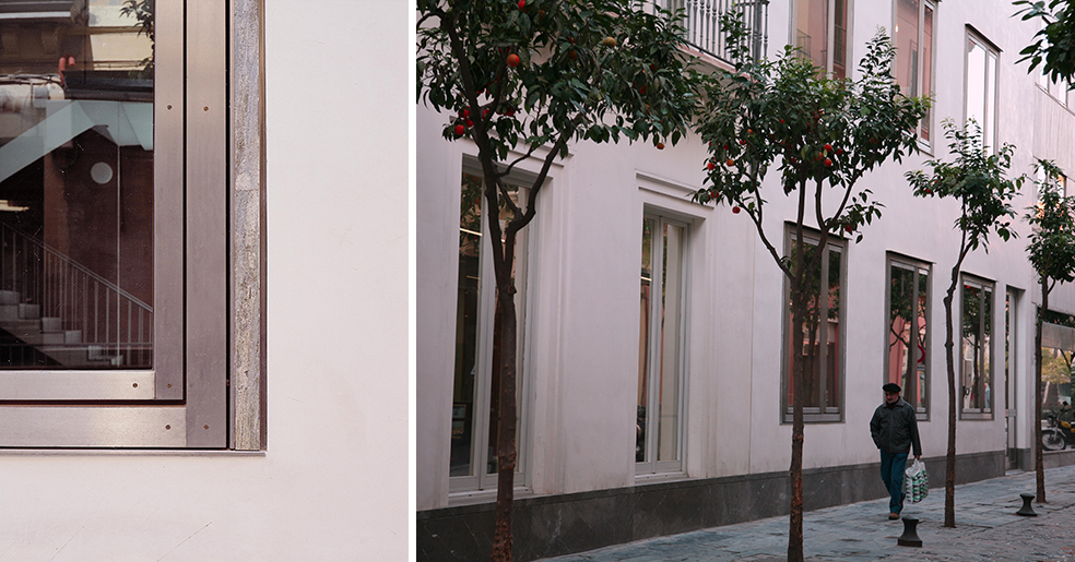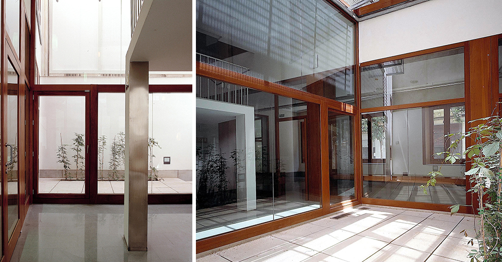 Para los espacios de oficina, la nueva edificación retoma la alineación de la medianera trasera de la casa existente, cuya planta traza, entre las dos calles de fachada y el edificio de la Plaza Nueva, un trapezoide, abriéndose ligeramente hacia la sede de la Consejería. Se desarrollan así repartidos en las tres plantas, una serie de salas alargadas con perspectivas dinámicas, que se comunican con el espacio de la escalera a través de generosos huecos acristalados. La fachada de estas salas se compone por un lado por la fachada de la casa rehabilitada, y por otro por la de la nueva edificación, que interpreta la rítmica vertical de la primera, pero ampliando los huecos y situando una carpintería imponente de acero inoxidable a ras de la cara exterior, mientras hacia el interior, las ventana muestran una acogedora cara de madera.