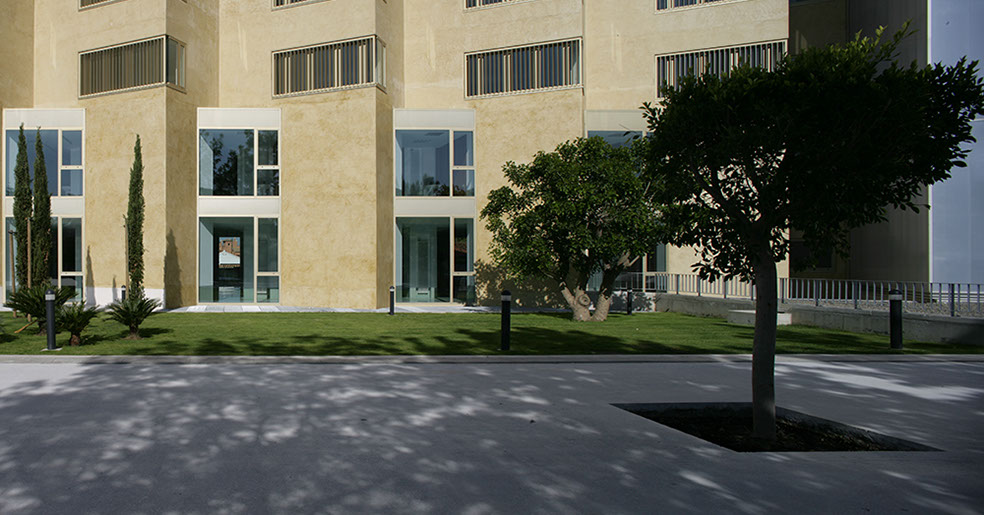 Se propone una mejor relación entre el espacio de parcela jardín-patio y el edificio, y la mejora del acceso principal. Facilitando todos los movimientos en la parcela con claridad. Asimismo se resuelven tanto el acceso mediante vehículos (autobuses, taxis...) hasta la puerta de la entrada de la residencia, como el de ambulancias y suministro por la entrada de servicio del ala Este.