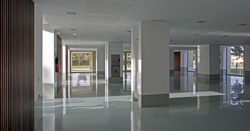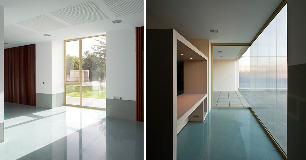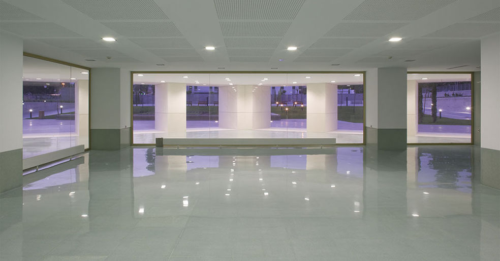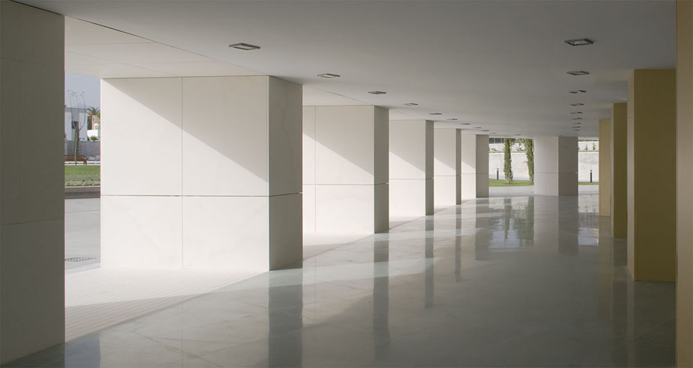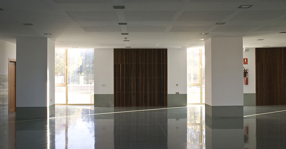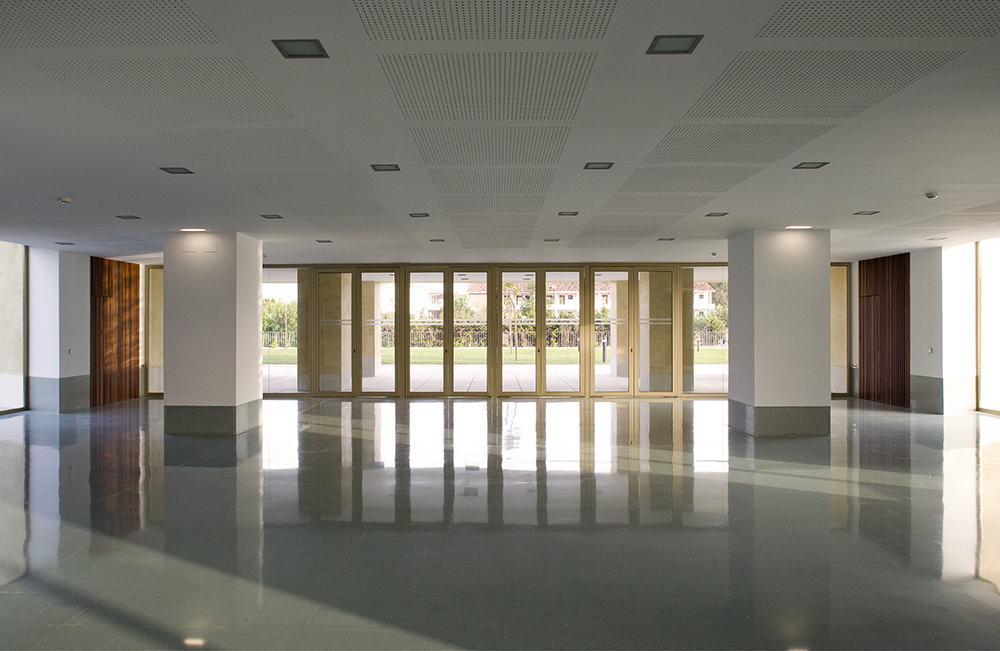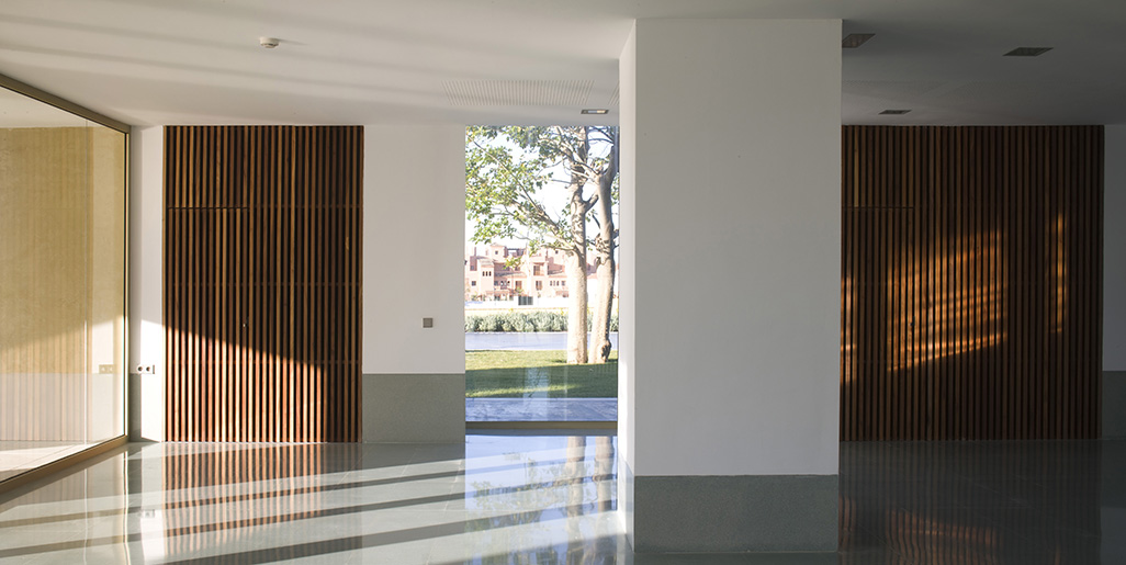 Se plantea así un acceso desde el norte a través de rampas suaves hacia el plano de la cota ±0,00, organizando en el primitivo semisótano el vestíbulo, con un porche de entrada previo, recepción, cabinas de teléfono, aseos y acceso a ascensores y escalera.