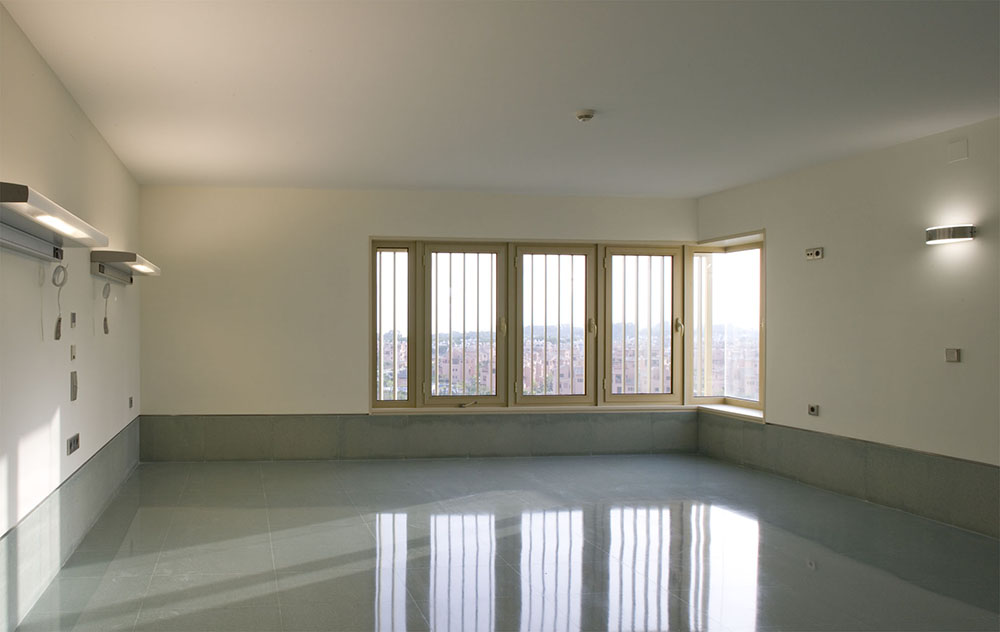 Las habitaciones se reforman al eliminar la terraza, consiguiendo un buen espacio diáfano. Se reforma el baño adecuándolo en su uso: duchas con ayudas geriátricas, pavimento antideslizante integrado con el resto del local y en la misma cota y demás ayudas para el resto de aparatos. En total se dispone de 98 habitaciones de las que 6 son individuales y 92 dobles con un máximo de 190 residentes.