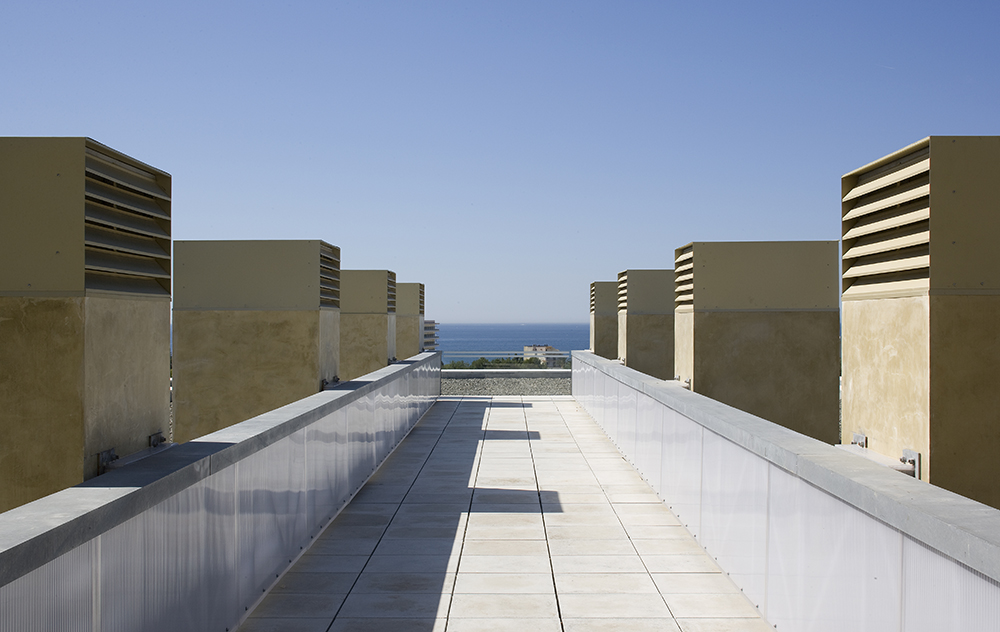 Las dos escaleras principales de comunicación vertical, a ambos costados cumplen los requerimientos normativos, escaleras cerradas y protegidas que no obligan a modificaciones estructurales, ya que son elementos externos. La orientada al oeste con vocación más pública y la este que conecta con el acceso de servicio acompañada por un montacargas y espacios de servicio en todas las plantas para apoyo a las habitaciones.