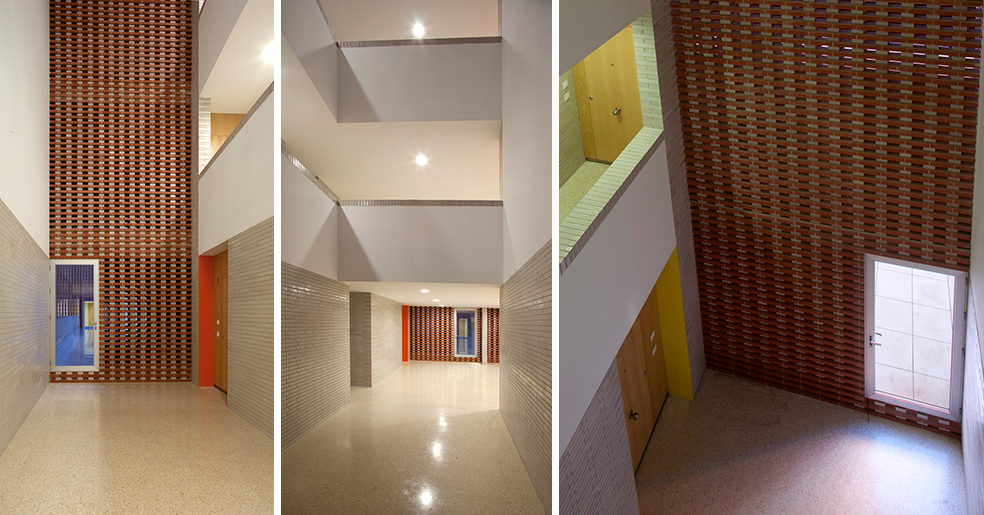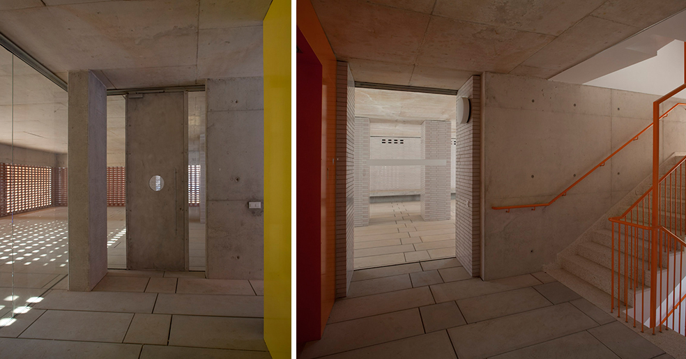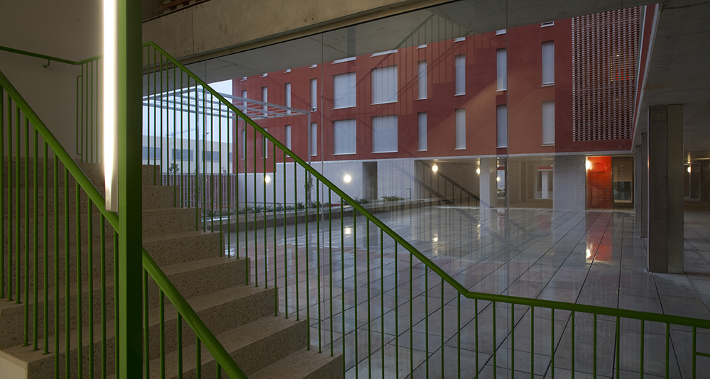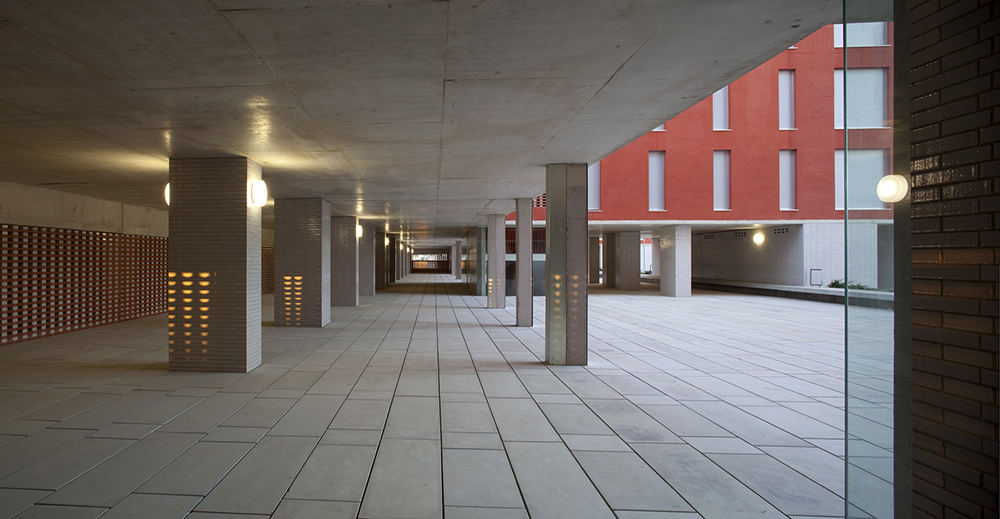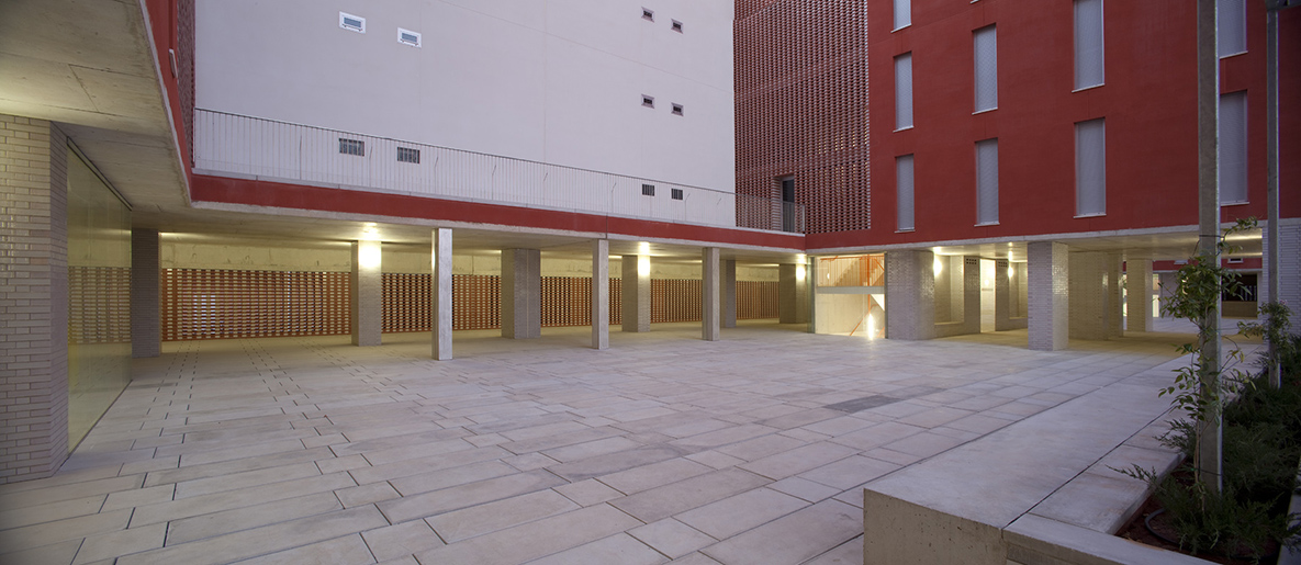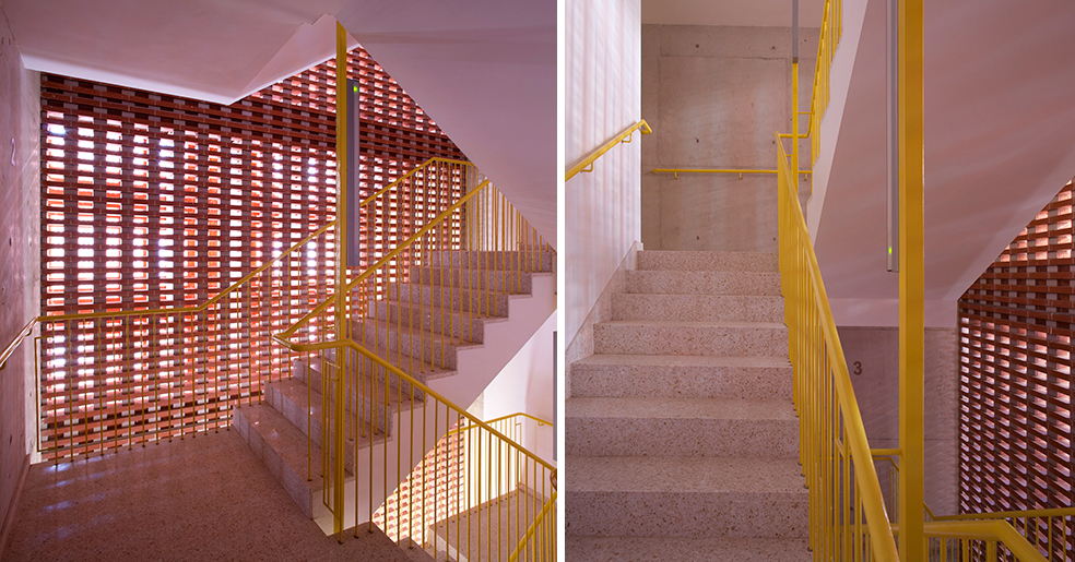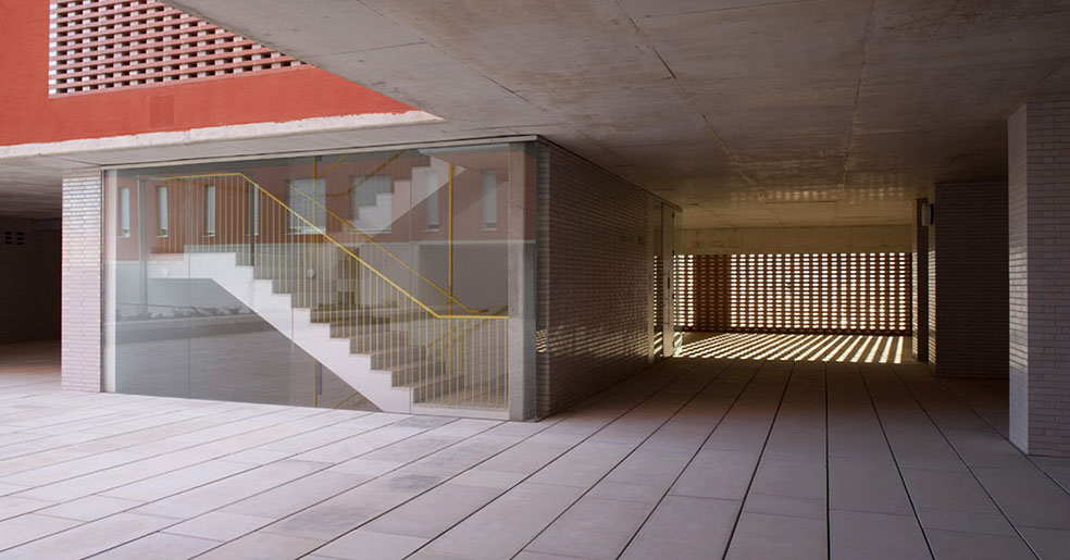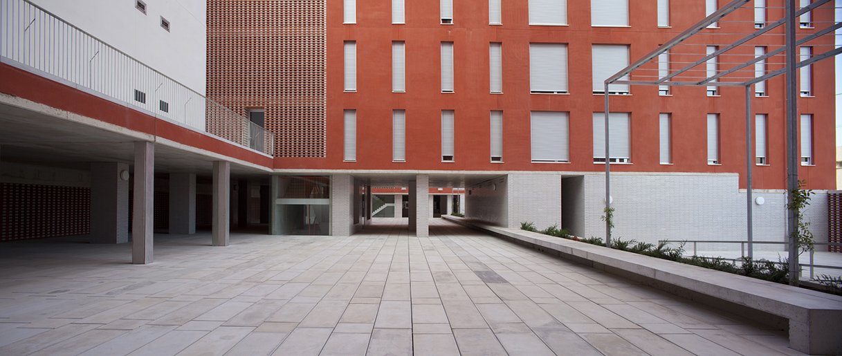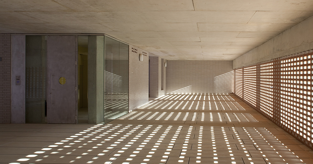 La planta baja libre, patios y porches, recibe (acceso a garaje, trasteros, buzones colectivos), y permite distribuir las tres escaleras que se integran como portales diáfanos de un conjunto, en una atmósfera de luz tamizada y recogida, un interior controlado por la celosía ventilada. Esta atmósfera se prolonga en los diversos niveles de acceso mediante aperturas entre plantas y hacia el exterior, lugares de recorrido y encuentro con luz controlada y ventilación natural. Se disponen espacios colectivos a diversos niveles de las terrazas.