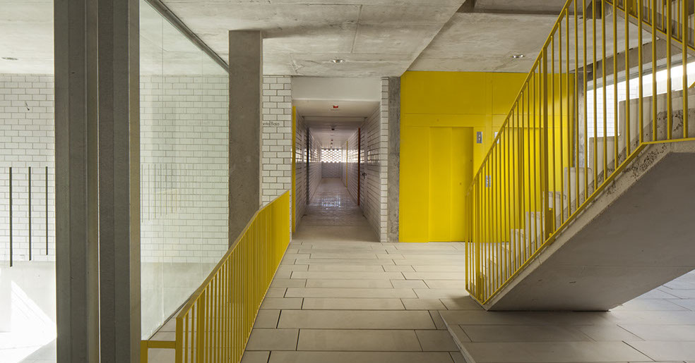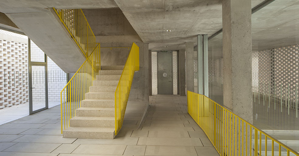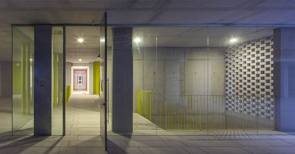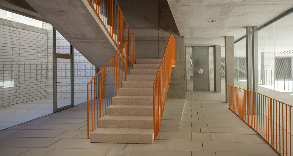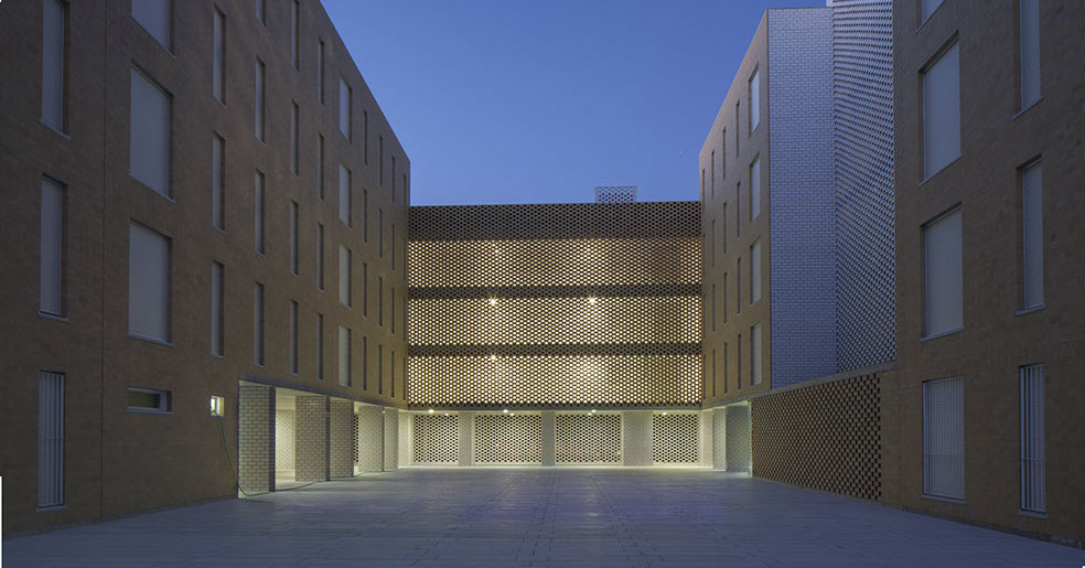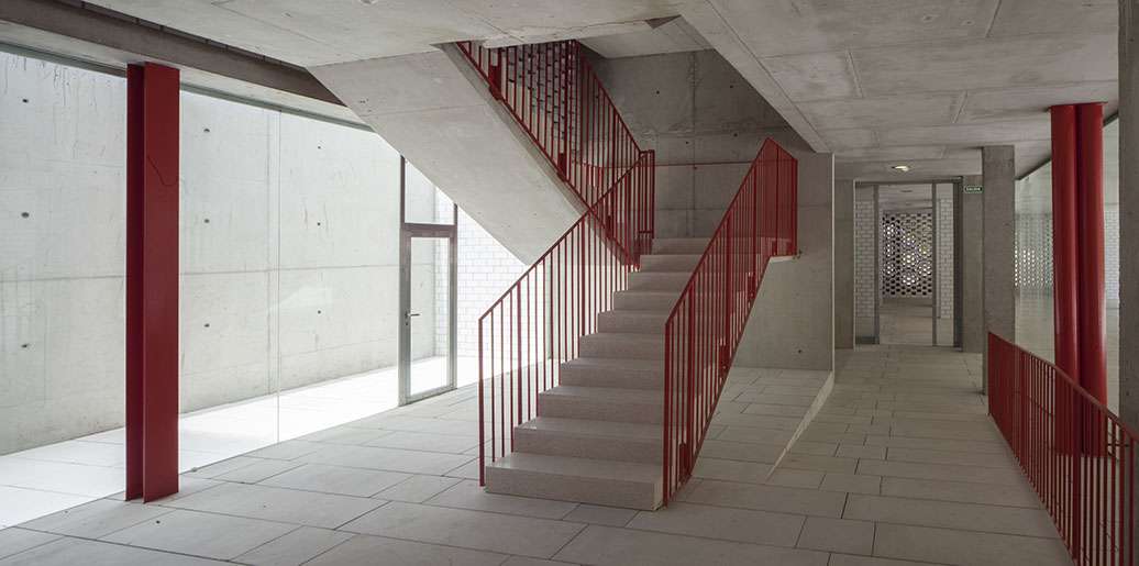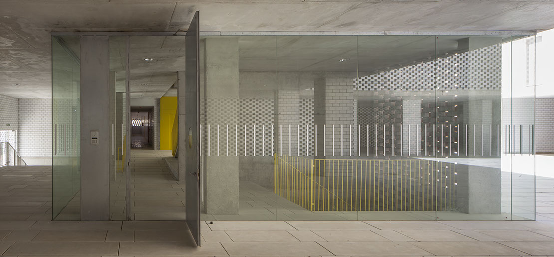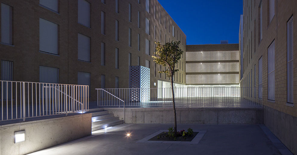 Los edificios de viviendas se estructuran mediante galerías centrales, abiertas en varios puntos y un núcleo de comunicación en relación con el patio. La intención de liberar la planta baja parcialmente, permite un espacio controlado de actividades por unidades vecinales y una continuidad entre los espacios públicos exteriores, los patios y el jardín del fondo a través de sistemas de celosías, que ciñiendolos, aseguran la transparencia y la ventilación. Se piensa en las diversas escalas y planos de relación; patios, galerías y terrazas de uso colectivo a distintos niveles.
