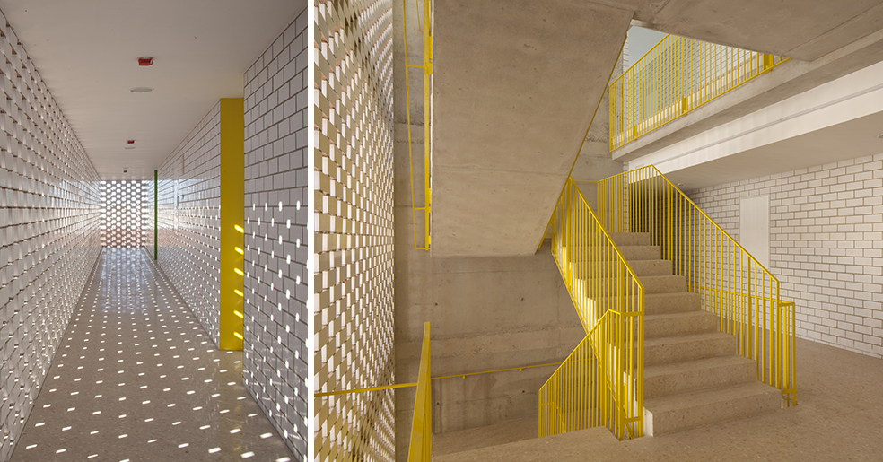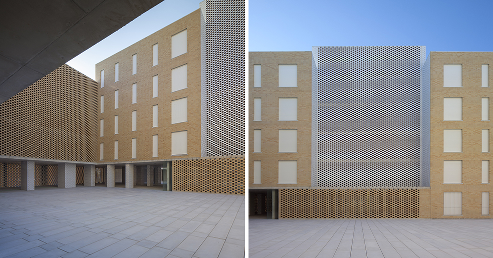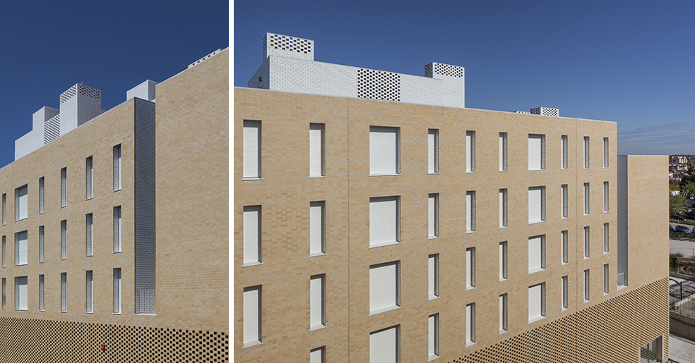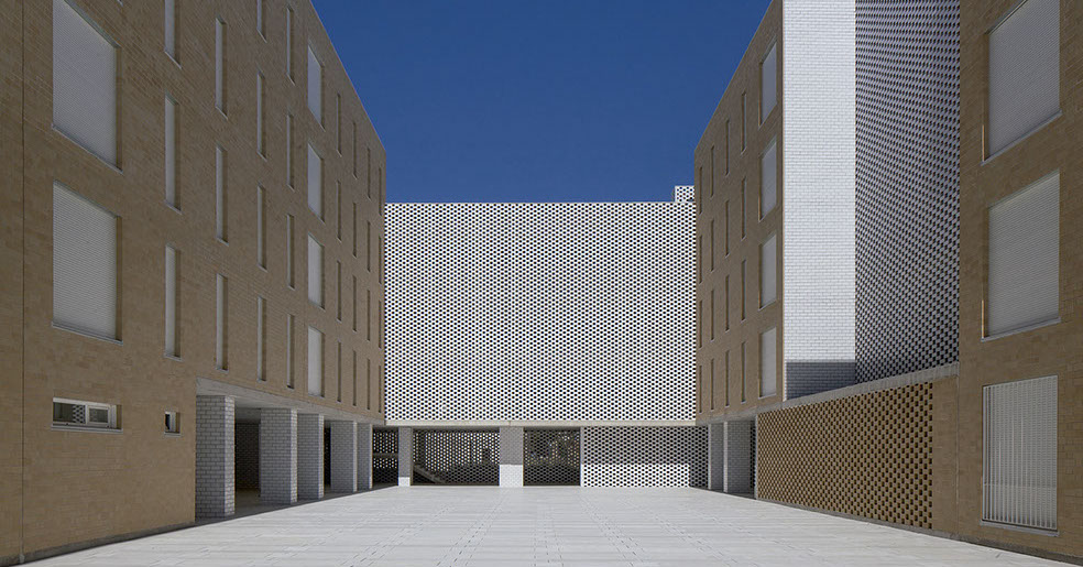 El material elegido, ladrillos de gran formato con aparejos diversos, toma su naturaleza de la interpretación de la construcción tradicional en el Puerto de Santa Maria, piedra clara para los elementos delimitadores y revoco blanco para las superficies. Así una piel de ladrillo tostado realiza el forro exterior y las hendiduras y elementos internos en ladrillo vidriado blanco. Las celosías de ladrillo tamizan la luz y posibilitan todo un mundo de transparencias y relaciones a la vez que permiten una ventilación de los espacios comunes adecuándolos climáticamente.